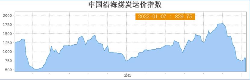 本周,沿海煤炭運(yùn)價(jià)小幅反彈。截至1月7日沿海煤炭運(yùn)價(jià)指數(shù)為829.75,較上周同期上漲80.84點(diǎn),漲幅10.66%;較上月同期下跌854.67點(diǎn),跌幅50.45%;較去年同期下跌427.92點(diǎn),跌幅33.76%。